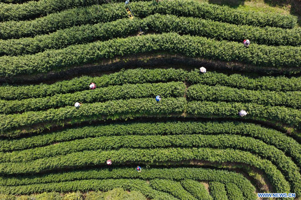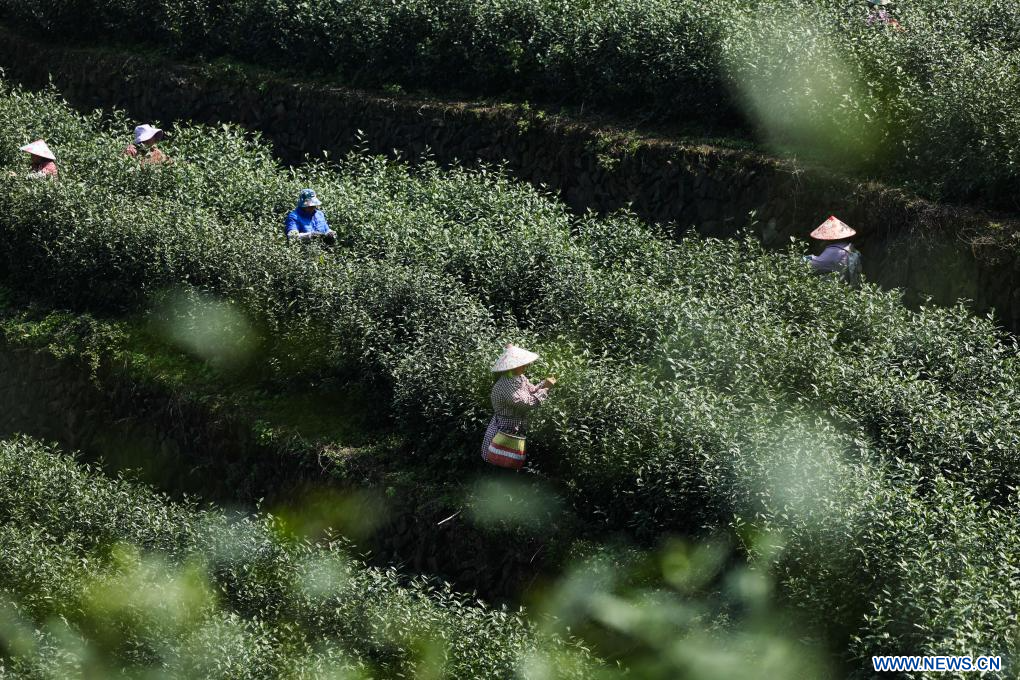 WUYI, 11 mars (Xinhua) -- Des agriculteurs récoltent des feuilles de thé de printemps dans un jardin de thé au district de Wuyi à Jinhua, ville de la province chinoise du Zhejiang (est), le 10 mars 2026.