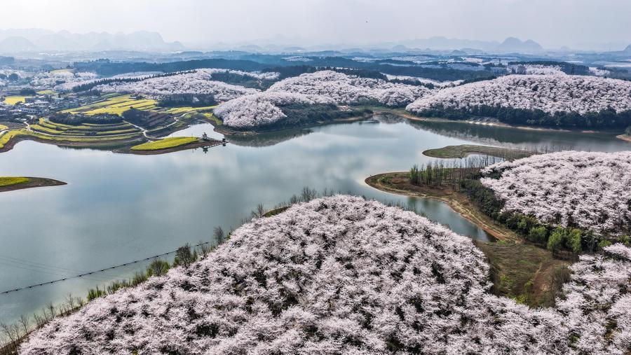 Des touristes visitent un verger de cerisiers dans la nouvelle zone de Gui'an, dans la province chinoise du Guizhou (sud-ouest), le 11 mars 2026. (Photo : Tao Liang)Photo aérienne des cerisiers en fleurs dans la nouvelle zone de Gui'an, dans la province chinoise du Guizhou (sud-ouest), le 11 mars 2026. (Photo : Tao Liang)Une touriste pose pour des photos au milieu des cerisiers en fleurs dans un verger de cerisiers dans la nouvelle zone de Gui'an, dans la province chinoise du Guizhou (sud-ouest), le 11 mars 2026. (Photo : Tao Liang)Des touristes visitent un verger de cerisiers dans la nouvelle zone de Gui'an, dans la province chinoise du Guizhou (sud-ouest), le 11 mars 2026. (Photo : Tao Liang)■