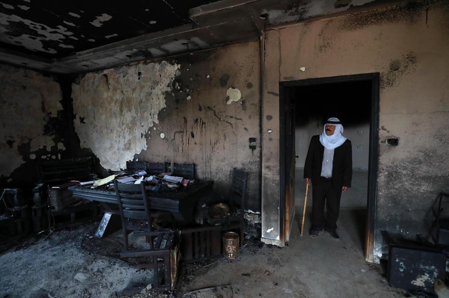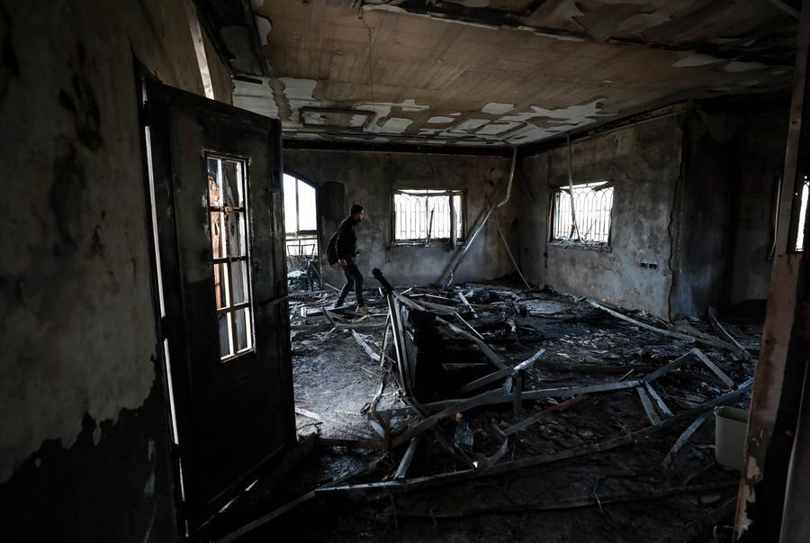 NAPLOUSE, 24 mars (Xinhua) -- Un Palestinien inspecte une maison endommagée qui a été incendiée par des colons israéliens, dans le village de Deir al-Hatab, à l'est de Naplouse en Cisjordanie, le 23 mars 2026. (Xinhua/Ayman Nobani)