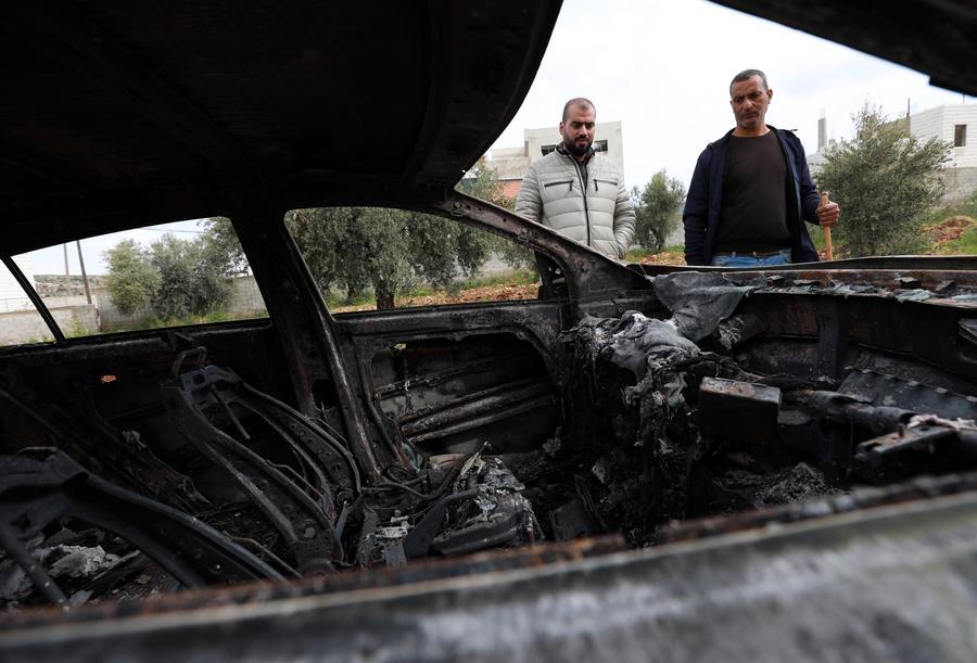 Des Palestiniens inspectent un véhicule incendié par des colons israéliens, dans le village de Deir al-Hatab, à l'est de Naplouse en Cisjordanie, le 23 mars 2026. (Xinhua/Ayman Nobani)