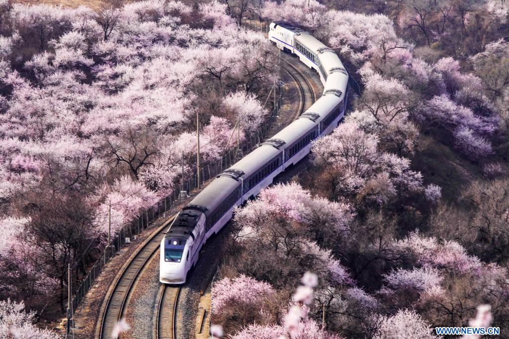 BEIJING, 25 mars (Xinhua) -- Un train circule au milieu d'arbres en fleurs près de la section de Juyongguan de la Grande Muraille, à Beijing, capitale chinoise, le 24 mars 2026. (Photo : Liu Mancang)