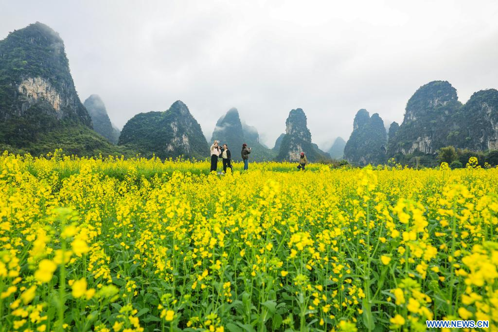 BEIJING, 25 mars (Xinhua) -- Des touristes admirent le paysage au milieu de champs de colza à Guilin, dans la région autonome Zhuang du Guangxi (sud de la Chine), le 24 mars 2026. (Photo : Liu Jiaoqing)