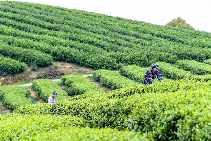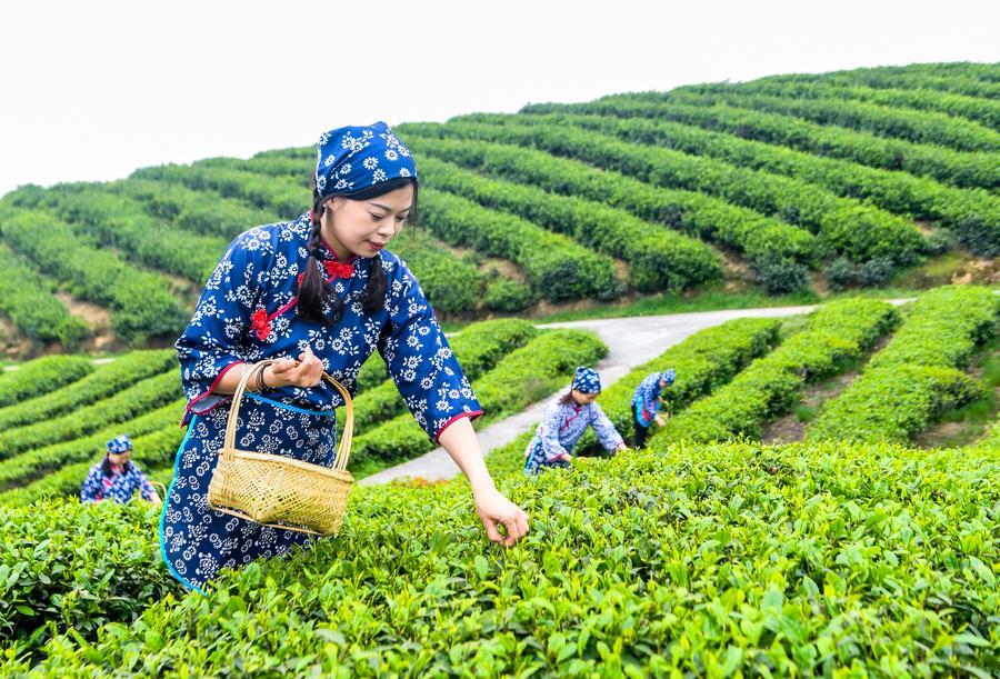 Photo d'agriculteurs cueillant des feuilles de thé dans l'arrondissement de Rongchang à Chongqing, dans le sud-ouest de la Chine, le 27 mars 2026. (Photo : Tang Yi)