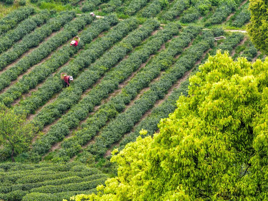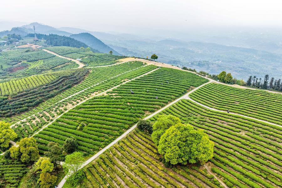 Photo aérienne d'agriculteurs cueillant des feuilles de thé dans l'arrondissement de Rongchang à Chongqing, dans le sud-ouest de la Chine, le 27 mars 2026. (Photo : Tang Yi)■