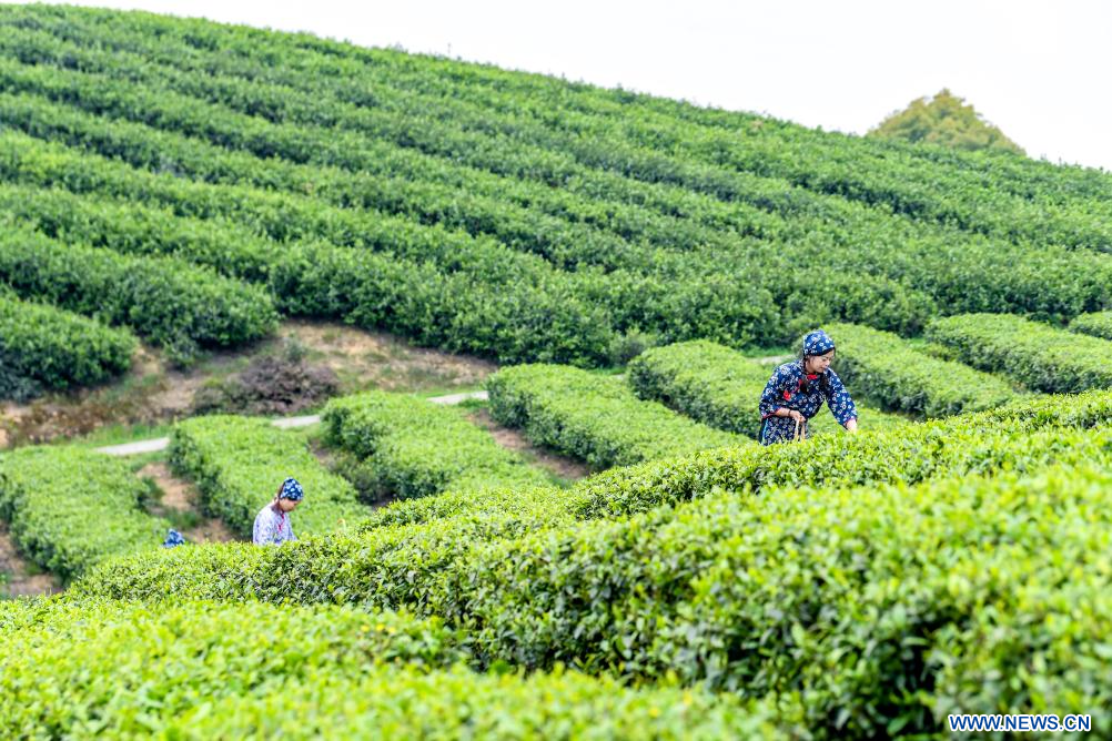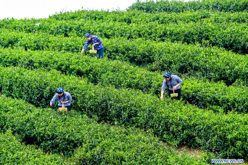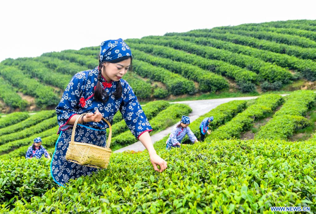 CHONGQING, 28 mars (Xinhua) -- Photo d'agriculteurs cueillant des feuilles de thé dans l'arrondissement de Rongchang à Chongqing, dans le sud-ouest de la Chine, le 27 mars 2026.