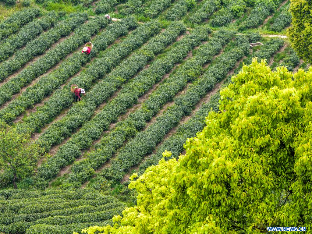 CHONGQING, 28 mars (Xinhua) -- Photo aérienne d'agriculteurs cueillant des feuilles de thé dans l'arrondissement de Rongchang à Chongqing, dans le sud-ouest de la Chine, le 27 mars 2026.