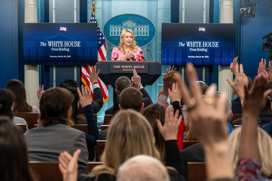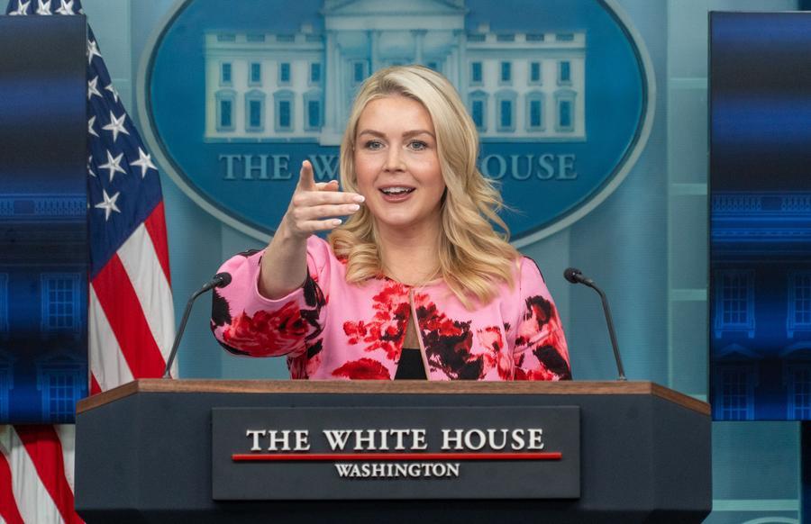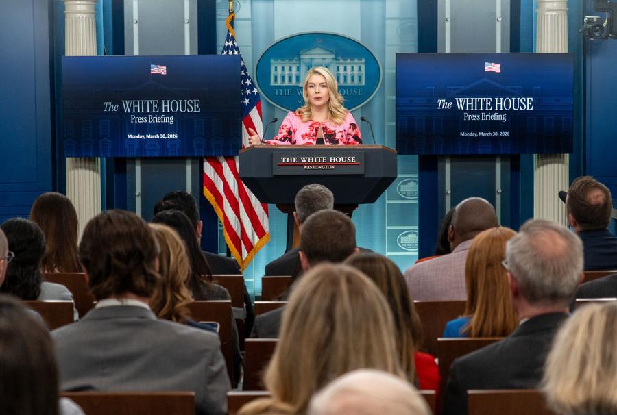 WASHINGTON, 30 mars (Xinhua) -- La porte-parole de la Maison Blanche, Karoline Leavitt, lors d'un point de presse à la Maison Blanche à Washington, aux Etats-Unis, le 30 mars 2026. Le président américain Donald Trump "serait tout à fait intéressé" par l'idée de demander aux pays arabes de contribuer au financement des coûts liés à la guerre en cours ménee par les Etats-Unis et Israël contre l'Iran, a-t-elle déclaré lundi. (Xinhua/Li Yuanqing)