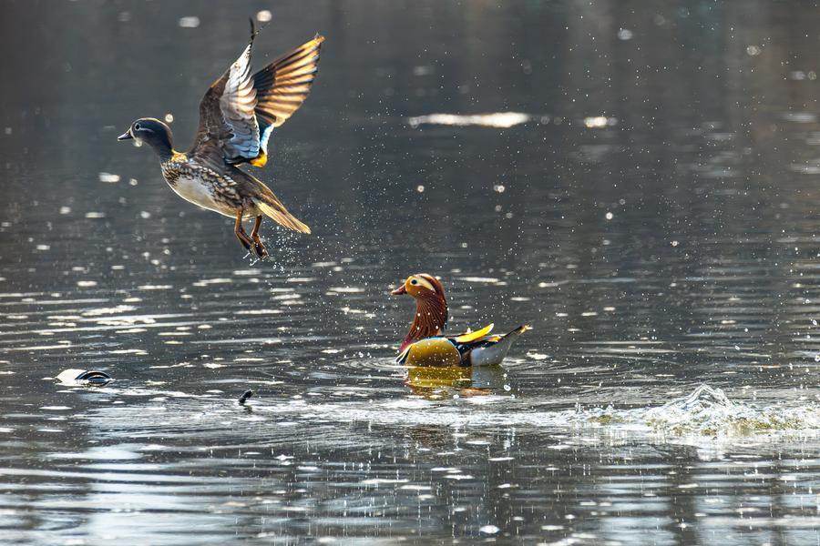 Des oiseaux sauvages barbotent à Vladivostok en Russie, le 2 avril 2026. (Xinhua/Andrey Matveenko)