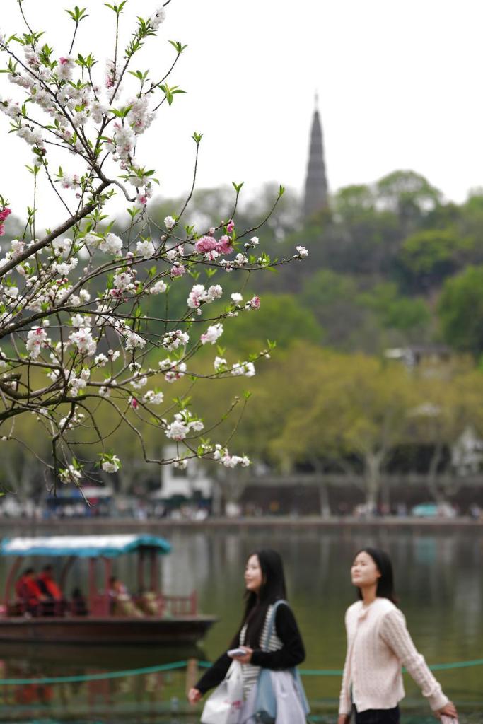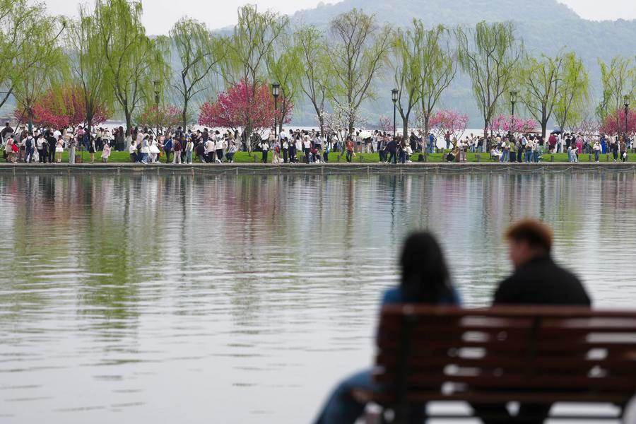 Des touristes visitent la zone pittoresque du lac de l'Ouest, à Hangzhou, dans la province chinoise du Zhejiang (est), le 2 avril 2026. (Photo : Huang Zongzhi)
