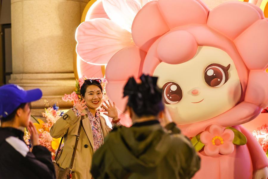 Une touriste pose pour une photo avec Tang Tang, la mascotte du festival des fleurs de pommier ornemental, dans le quartier historique de Wudadao, à Tianjin, dans le nord de la Chine, le 3 avril 2026.(Photo : Du Penghui)
