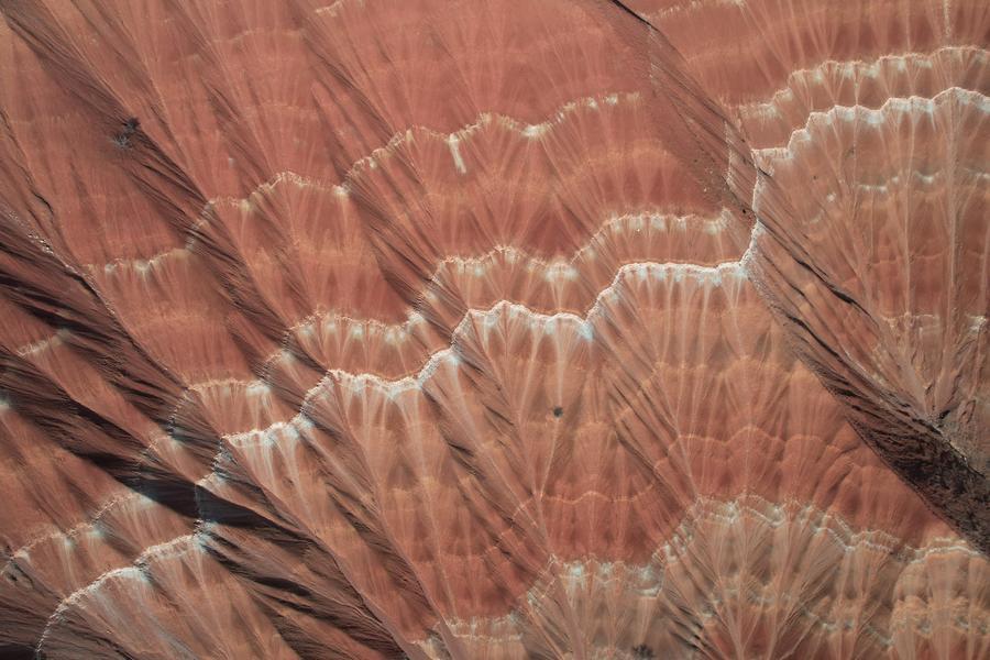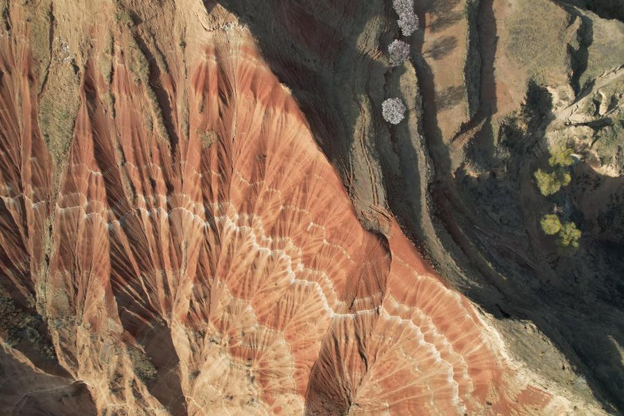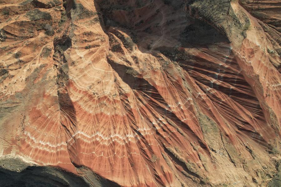 Photo aérienne prise par un drone montrant une vue des reliefs Danxia dans le bourg de Dongyuan du district autonome de Dongxiang, relevant de la préfecture autonome Hui de Linxia, dans la province chinoise du Gansu (nord-ouest), le 3 avril 2026. (Photo : Zhang Zhimin)