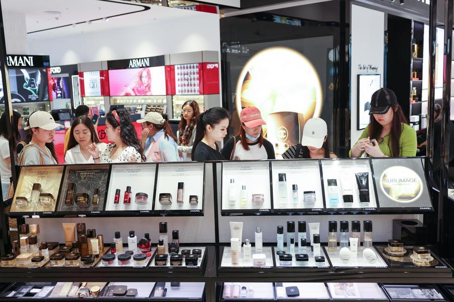 BEIJING, 7 avril (Xinhua) -- Au Haikou International Duty-Free Shopping Complex, le plus grand centre commercial hors taxe au monde situé à Haikou, capitale de la province insulaire de Hainan (sud de la Chine), l'espace dédié aux cosmétiques et aux produits de luxe attire un flux continu de visiteurs.