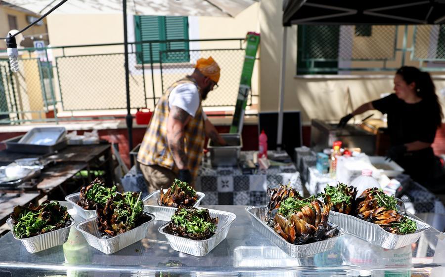 LADISPOLI, 11 avril (Xinhua) -- Des en-cas à base d'artichaut sont exposés lors d'une fête de l'artichaut violet à Ladispoli, en Italie, le 10 avril 2026. Ce rendez-vous annuel célébrant la récolte de l'artichaut violet a commencé vendredi. (Xinhua/Wang Kaiyan)