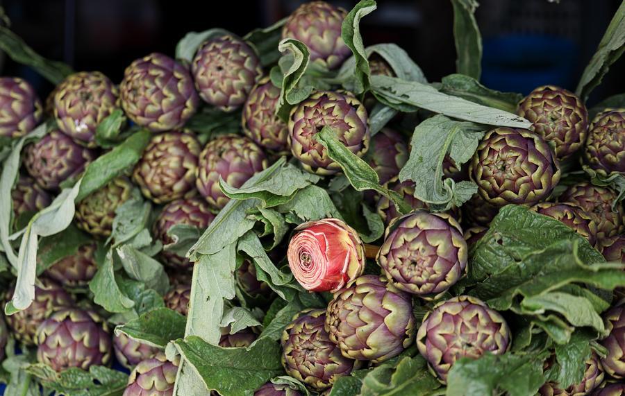 LADISPOLI, 11 avril (Xinhua) -- Des artichauts sont photographiés lors d'une fête de l'artichaut violet à Ladispoli, en Italie, le 10 avril 2026. Ce rendez-vous annuel célébrant la récolte de l'artichaut violet a débuté vendredi. (Xinhua/Wang Kaiyan)