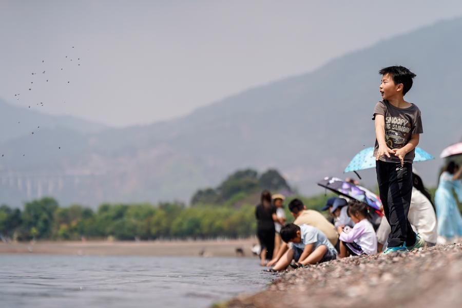 Des enfants jouent au bord du lac Fuxian, dans la ville de Yuxi de la province chinoise du Yunnan (sud-ouest), le 18 avril 2026. (Photo : Peng Yikai)