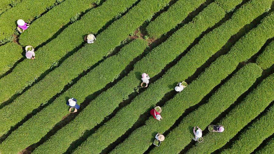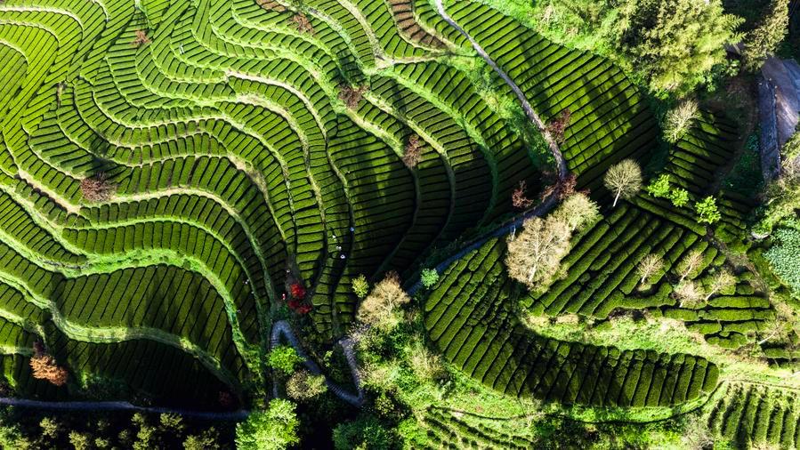 Photo aérienne prise par un drone d'agriculteurs cueillant des feuilles de thé dans une plantation du village de Huazhishan, à Tunbao, bourg de la préfecture autonome Tujia et Miao d'Enshi, dans la province chinoise du Hubei (centre), le 18 avril 2026. (Photo : Wen Lin)■