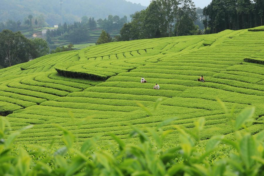 Des agriculteurs cueillent des feuilles de thé dans une plantation du bourg de Tuantian, à Tengchong, ville de la province chinoise du Yunnan (sud-ouest), le 20 avril 2026. (Photo : Gong Zujin)