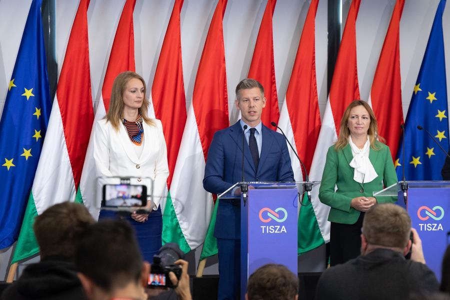 BUDAPEST, 20 avril (Xinhua) -- Peter Magyar (au centre), chef du Parti Tisza, s'exprime lors d'une conférence de presse à l'issue de la première réunion de son groupe parlementaire à Budapest, capitale de la Hongrie, le 20 avril 2026. M. Magyar a déclaré lundi que le nouveau gouvernement s'efforçait de débloquer dans les plus brefs délais les fonds gelés de l'Union européenne (UE), à la suite de récentes discussions techniques avec des responsables de l'UE à Budapest. Les résultats définitifs publiés samedi par le Bureau national des élections de Hongrie ont confirmé que le parti Tisza avait remporté une majorité des deux tiers lors des élections législatives du 12 avril. (Xinhua/Attila Volgyi)
