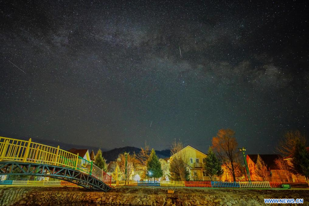 HARBIN, 23 avril (Xinhua) -- La pluie d'étoiles filantes des Lyrides observée depuis la station de ski de Yabuli, dans la province du Heilongjiang, dans le nord-est de la Chine, le 23 avril 2026.