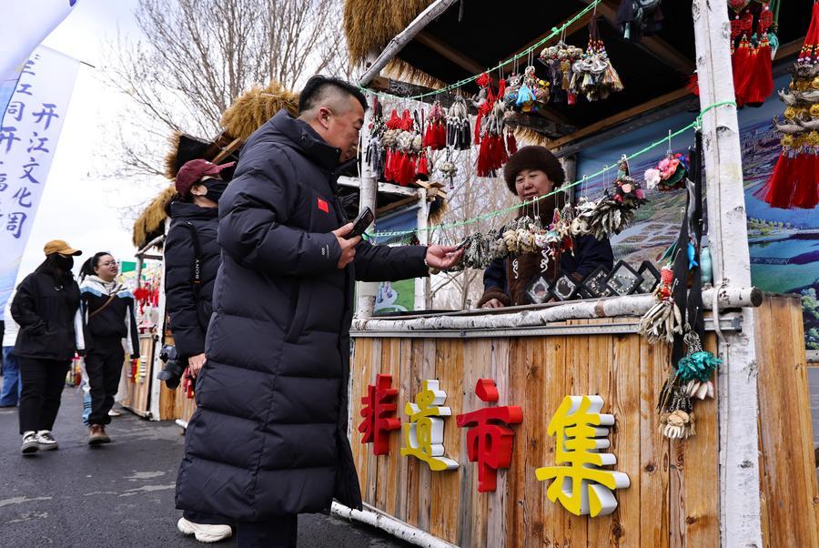 Des visiteurs choisissent des produits lors d'une foire consacrée au patrimoine culturel immatériel dans le cadre de la Semaine de la culture populaire "Kaijiang" à Tongjiang, dans la province chinoise du Heilongjiang (nord-est), le 25 avril 2026. (Photo : Liu Wanping)