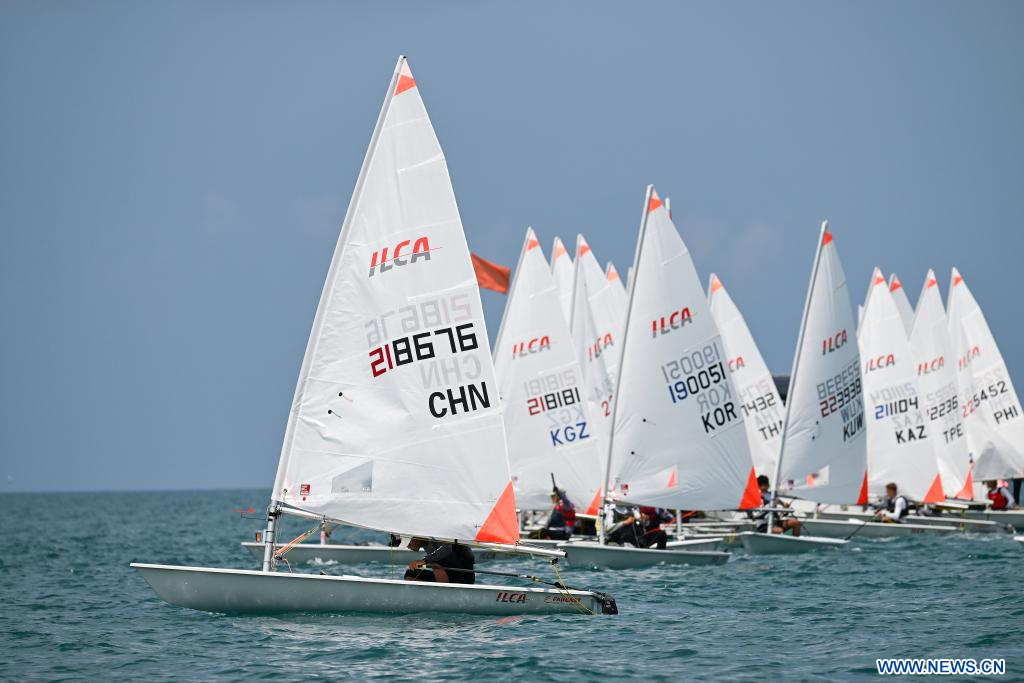 SANYA, 27 avril (Xinhua) -- Des athlètes s'affrontent lors de la régate ILCA4 féminine aux 6es Jeux asiatiques de plage à Sanya, dans la province chinoise de Hainan (sud), le 27 avril 2026. (Photo : Wei Hai)
