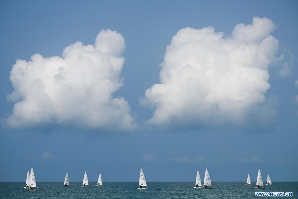 SANYA, 27 avril (Xinhua) -- Des athlètes s'affrontent lors de la régate ILCA4 masculine aux 6es Jeux asiatiques de plage à Sanya, dans la province chinoise de Hainan (sud), le 27 avril 2026. (Photo : Wei Hai)