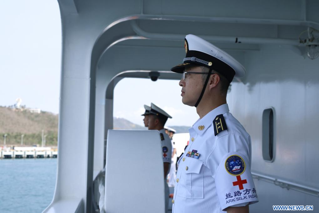 SANYA, 27 avril (Xinhua) -- Les membres d'équipage du navire-hôpital de la Marine de l'Armée populaire de libération (APL) de Chine, l'Arche de la Route de la Soie, se tiennent en formation alors que le navire accoste dans un port militaire à Sanya, dans la province de Hainan (sud de la Chine), le 26 avril 2026. (Photo : Cui Xiaoyang)