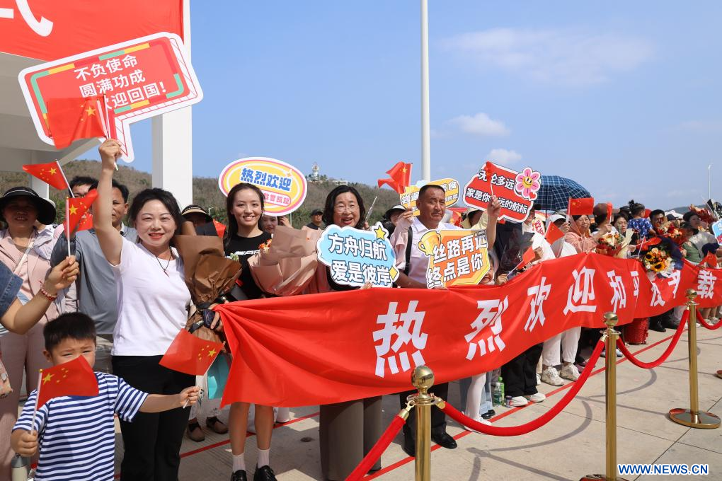 SANYA, 27 avril (Xinhua) -- Photo prise le 26 avril 2026 montrant la cérémonie d'accueil organisée pour le navire-hôpital de la Marine de l'Armée populaire de libération (APL) de Chine, l'Arche de la Route de la Soie, dans un port militaire à Sanya, dans la province de Hainan (sud de la Chine). (Photo : Cui Xiaoyang)