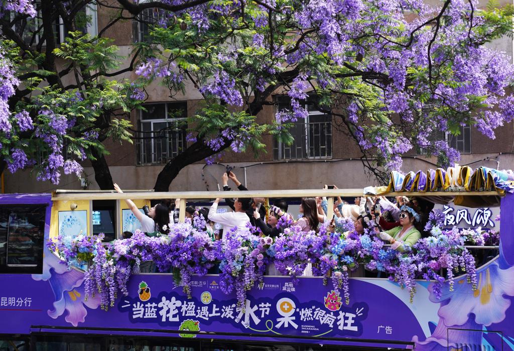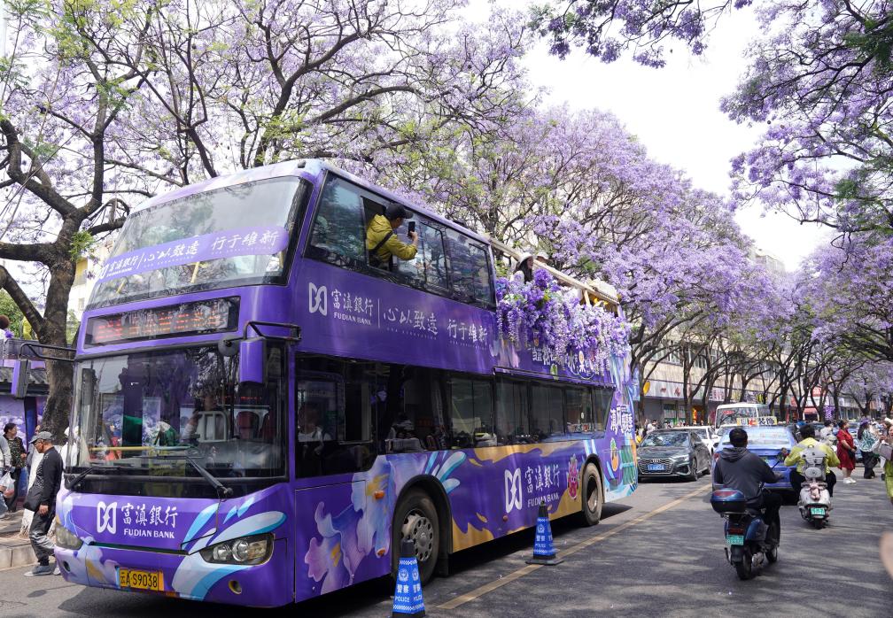 KUNMING, 28 avril (Xinhua) -- Des touristes prennent un bus touristique pour admirer les jacarandas en fleurs à Kunming, dans la province chinoise du Yunnan (sud-ouest), le 27 avril 2026. (Photo: Liang Zhiqiang)