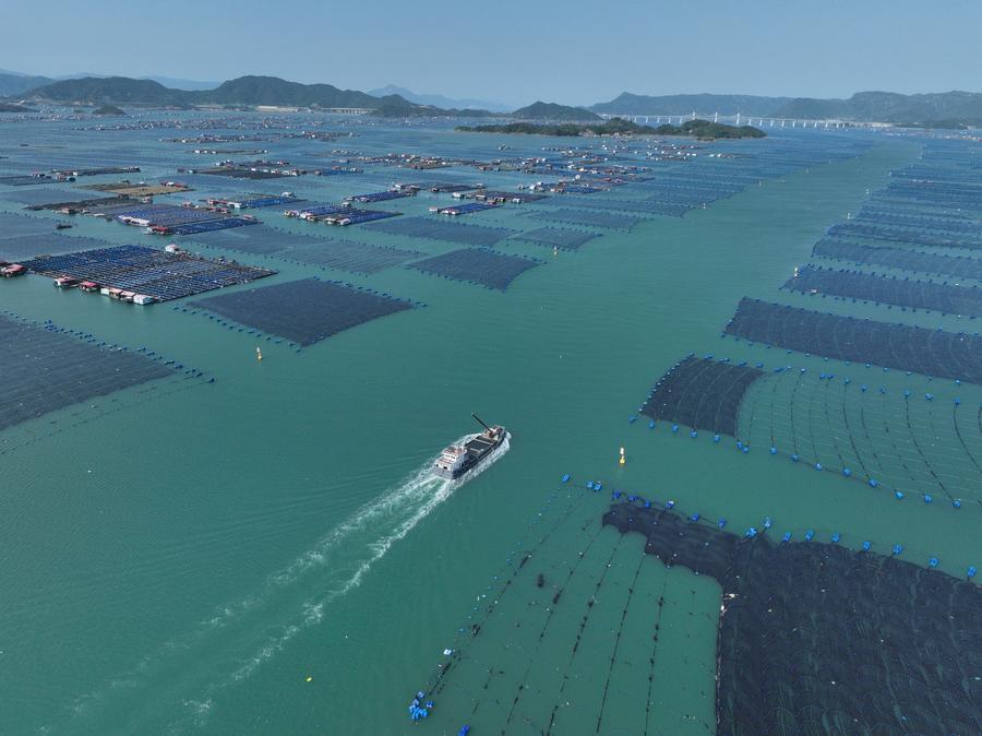 Des ouvriers relâchent des alevins de grande courbine jaune dans des plateformes d'aquaculture d'une ferme aquacole dans le district de Xiapu, à Ningde, dans la province chinoise du Fujian (sud-est), le 25 avril 2026.(Photo : Jiang Kehong)■